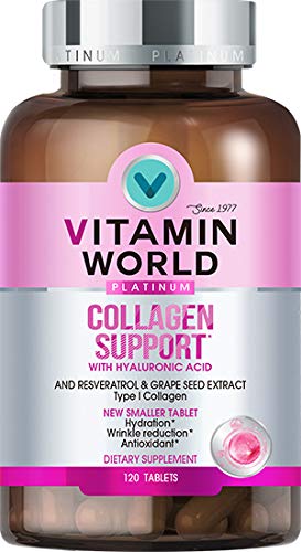 Vitamin World Platinum Collagen Support 1000 mg. 120 Tablets, Formulated with Grape Seed Extract, Resveratrol, Hyaluronic Acid, Wrinkle Reduction**, Promotes Vibrant and Youthful Appearance